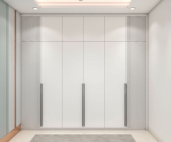 MODERN 4 DOOR OFF WHITE SWING WARDROBE DESIGN WITH VERTICAL GROOVE ACCENTS